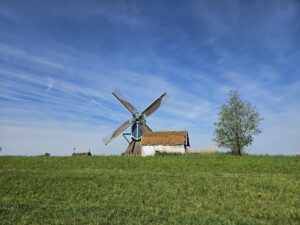 In de verte zien we de Rietveldse molen, die kant gaan we op. Via het mooie Kerkvaartpad komen we weer in andere omgeving, die van boomkwekers van Boskoop en omstreken. Het is nog lekker rustig op de paden en we zien Jeu de Boer al liggen. Enthousiast zwaaiend komen we een paar Berkelse (TCP) fietsers tegen.